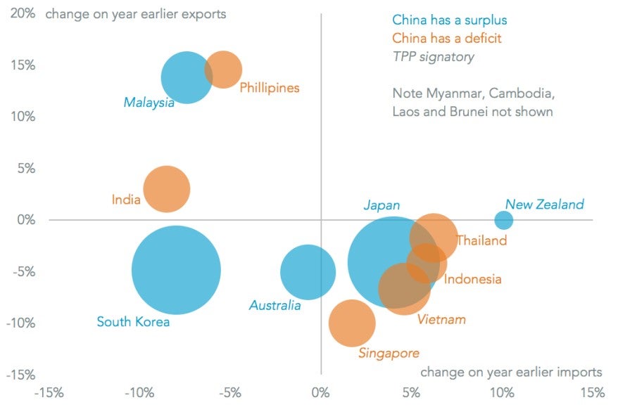 Chart segments Chinese exports and imports for calendar 2016, compared to 2015, by country of origin. Bubble size indicates total trade, bubble color shows whether China had a surplus (blue) or deficit (orange) while italicized labels indicate TPP participation.